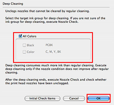 按一下[最初確認項目(Initial Check Items)]時,將在執行「深度清潔(Deep Cleaning)」前顯示確認項目。
