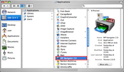 2. 要打開「應用程式(Applications)」資料夾,按一下安裝有「MP Navigator」硬碟的圖示,再按兩下「MP Navigator 2.0」的圖示。