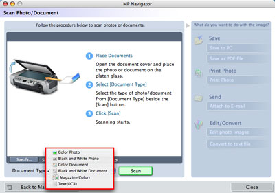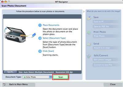 根據不同的目的,可以使用用於掃描數據的其他功能,如「儲存(Save)」、「複製(Copy)」、「列印相片(Print Photo)」、「傳送(Send)」和「編輯/轉換(Edit/Convert)」。