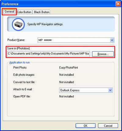 要使用 MP Navigator 掃描,請轉到「一般」標籤。要透過操作面板掃描,請轉到「彩色按鈕」標籤或「黑白按鈕」標籤。