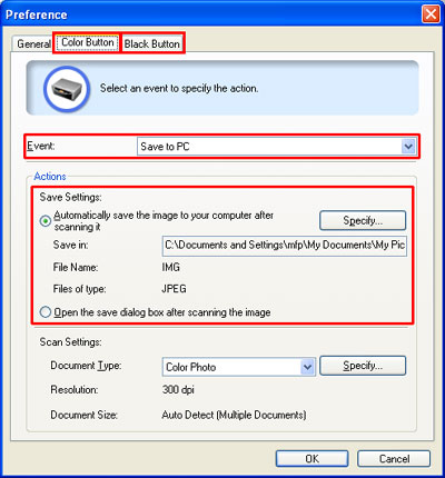 如果在印表機處於掃描模式時按操作面板上的「彩色啟動」按鈕或「黑白啟動」按鈕,則可以分別執行「彩色按鈕」標籤或「黑白按鈕」標籤中的設定。