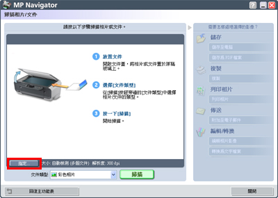 1) 使原稿玻璃上的文件類型與「MP Navigator」中設定的文件類型相匹配。