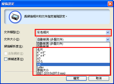 3-2-2. 在「文件大小」中選取要掃描文件的正確大小(例如,A4 或 letter 大小)。