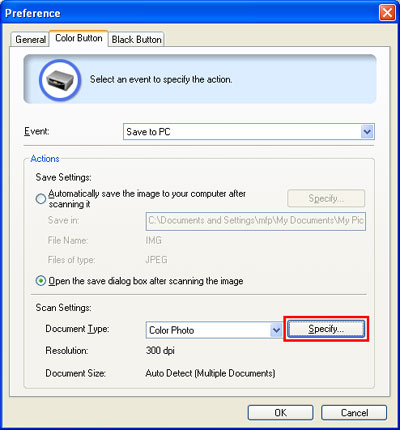 3-2. 按一下「掃描設定(Scan Settings)」部份的[指定(Specify)]。