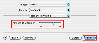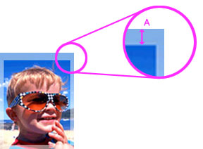 延伸到紙張之外的影像量(參見下圖中的「A」)被稱為擴展量,可以使用捲軸調整。