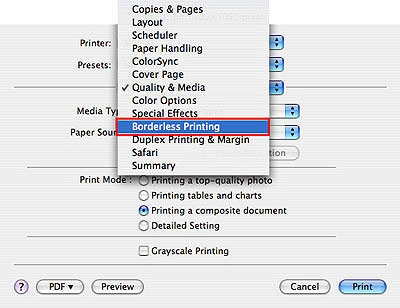 7-1. 在第三個快顯功能表中,選取[滿版列印(Borderless Printing)]。