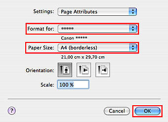 2. 在「格式用於(Format for)」中選取所用的印表機型號並選取以滿版顯示的紙張大小。