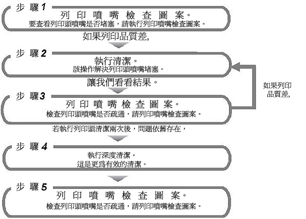 如果列印頭噴嘴堵塞,可以透過執行列印頭清潔(「清潔」)或列印頭深度清潔(「深度清潔」)來改善列印品質素。