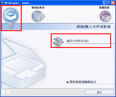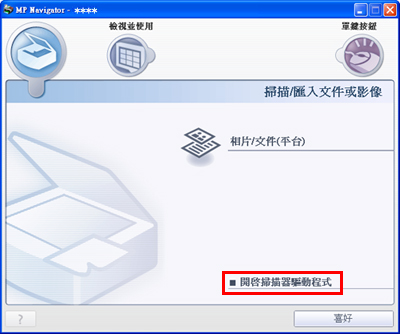 1. 啟動「MP Navigator」並按一下「掃描/匯入」標籤上的「開啟掃描器驅動程式」。