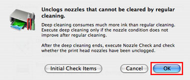 「深度清潔(Deep Cleaning)」將會比「清潔(Cleaning)」消耗更多的墨水; 所以僅在執行「清潔(Cleaning)」後噴嘴狀況仍沒有改善的情況下執行「深度清潔(Deep Cleaning)」。
