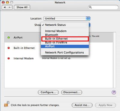 2. 在「顯示(Show)」快顯功能表中,選取「內建乙太網路(Built-in Ethernet)」。