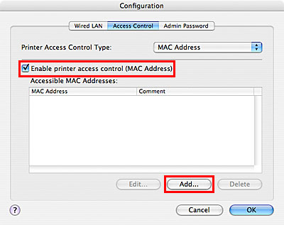 10. 勾選「啟用印表機存取控制(MAC 位址)( Enable printer access control (MAC Address))」,然後按一下[新增(Add)]。