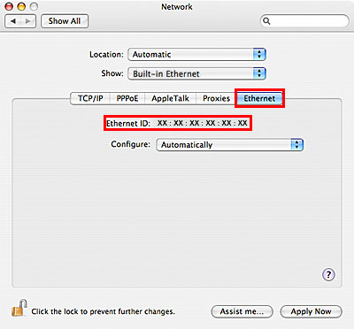 3. 按一下「內建乙太網路(Built-in Ethernet)」標籤,記下顯示的「乙太網路 ID(Ethernet ID)」值。