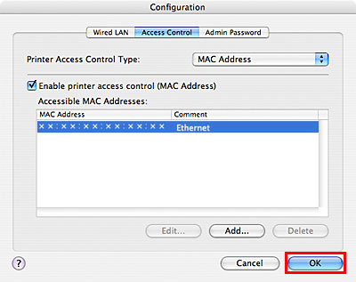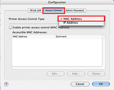 按一下「存取控制(Access Control)」,然後在「印表機存取控制類型(Printer Access Control Type)」中選取「MAC 位址(MAC Address)」。
