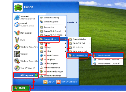 如果桌面上沒有顯示[ZoomBrowser EX]圖示,請按一下[開始(Start)] > [所有程式(All Programs)](或[程式(Program)]) > [Canon Utilities] > [ZoomBrowser EX]並選擇[ZoomBrowser EX]以啟動該程式。