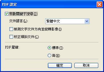 按一下[設定...]開啟對話方塊並指定 PDF 壓縮類型與用於創建 PDF 檔案的其他進階設定。