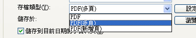 3. 在[存檔類型]裡選取[PDF(多頁)]或[PDF(新增頁)]。