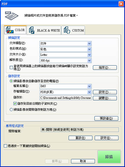 可以指定要儲存的輸出解析度、文件大小與資料夾。也可以將多份文件儲存為一個 PDF 檔案或創建可搜尋的 PDF 檔案。