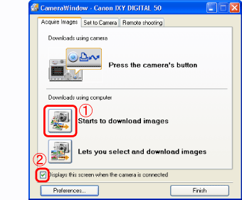 如果「CameraWindow」未自動出現,按[開始(Start)]按鈕,然後依次序選擇[所有程式(All Programs)]或[程式(Program)]、[Canon Utilities]、[CameraWindow]及[CameraWindow]以開啟「CameraWindow」。