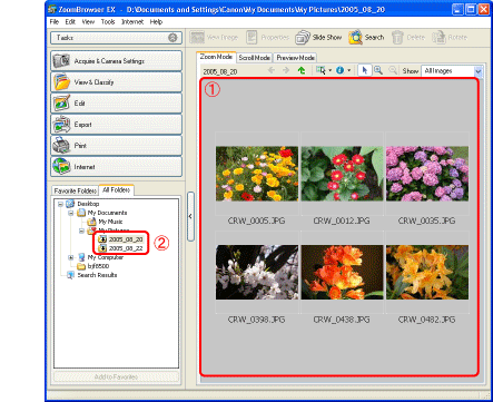 下載的影像會儲存於以拍攝日期命名的資料夾並顯示於「ZoomBrowser EX」主視窗。