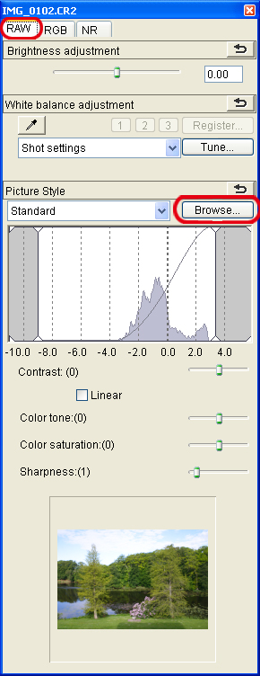 4. 在工具板中選擇[RAW]設定頁以按一下相片風格 [瀏覽(Browse)]。