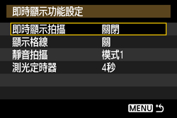 5. 轉動<速控轉盤>從顯示的選單項目中選擇[即時顯示拍攝功能],然後按<SET>按鈕。