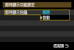 7. 按<SET>按鈕。請確保[即時顯示拍攝功能-啟動]設定完成,然後按兩次<MENU>按鈕。