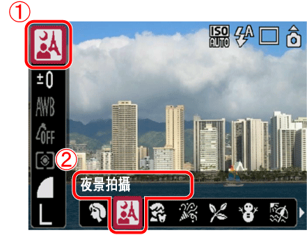 [夜景拍攝]( ) 是清晰拍攝主體及夜幕背景的模式。本節介紹如何設定[拍攝模式]為[夜景拍攝]( )。