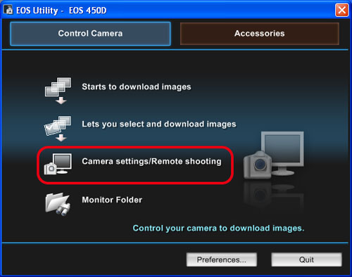 3. 出現下方視窗後,按一下[相機設定/遙控拍攝(Camera settings/Remote shooting)]。