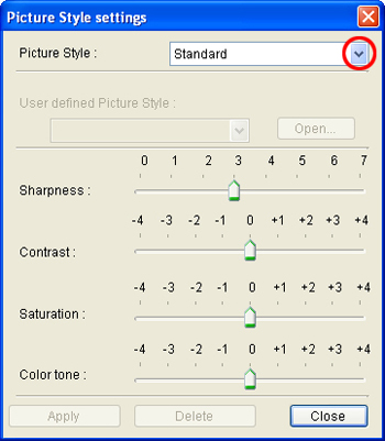 6. 在出現的[相片風格設定(Picture Style settings)]對話方塊中,從[相片風格(Picture Style)]清單方塊中選擇一個使用者定義選項(例如,此處選擇的是[使用者定義 1(User Defined 1)])。