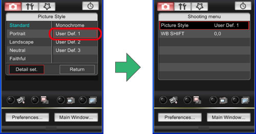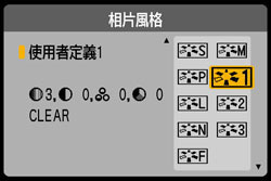 >以在液晶螢幕顯示相片風格視窗。您可以確認使用「EOS Utility」註冊的相片風格檔案已應用於[使用者定義 1]。