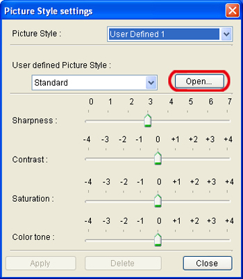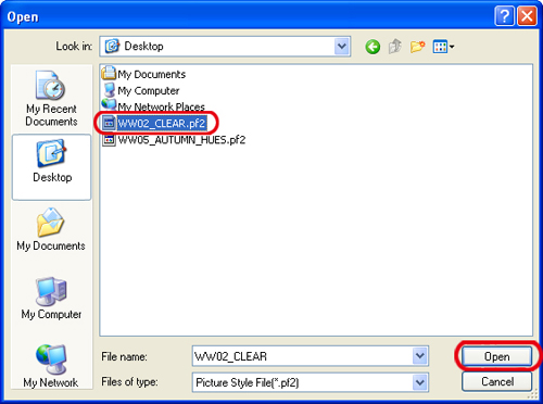 8. 在出現的[開啟(Open)]對話方塊中,選擇個人電腦中儲存的相片風格檔案(副檔名為「.pf2」),然後按一下[開啟(Open)]。