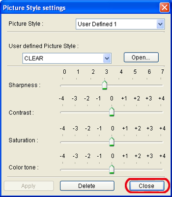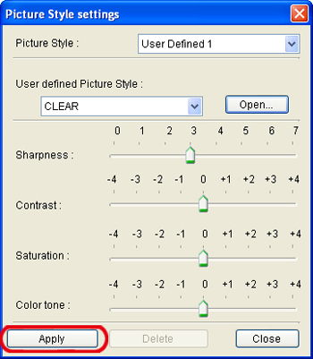 9. 在再次出現的[相片風格設定(Picture Style settings)]對話方塊中,按一下[應用(Apply)]。