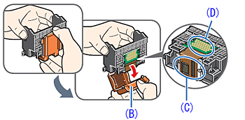 請勿觸摸列印頭噴嘴 (C) 和電氣觸點 (D)。