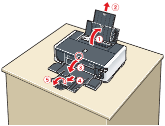 開啟後端托盤,然後拉出托紙架擴展架。按開啟按鈕開啟出紙托盤,然後開啟出紙托盤擴展架。