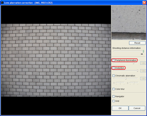 6. 關閉 [鏡頭像差校正 (Lens aberration correction)] 視窗後,修正的結果反映於編輯視窗中的影像並重新顯示此影像。