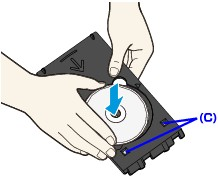 - 當在 CD-R 托盤上放置 DVD/CD 時,請勿觸摸光碟的列印面或 CD-R 托盤的反射鏡(C)。