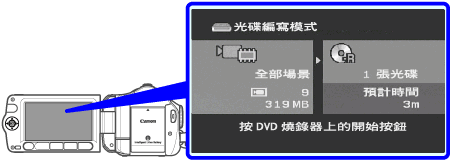 - 光碟被識別後,將出現資訊螢幕,顯示您正在創建的 DVD 類型及需要花費的時間及光碟數量(因插入的光碟而異)。