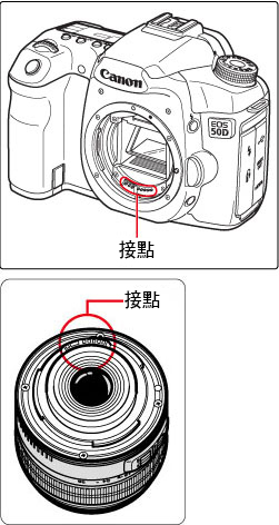 如有一方的接點髒污,則無法正常通訊,並且有些情況下自動對焦可能無法正常操作。如果鏡頭或相機接點髒污,請使用清潔的乾布輕輕擦拭。