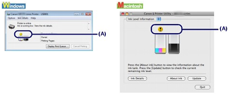 您可以在印表機狀態監視器(Windows)或 Canon IJ Printer Utility (Macintosh)確認墨水狀態。
