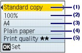 (3) 確認影印類型、擴展量、頁面大小、媒體類型等。