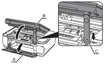 2. 抬起掃描單元(機蓋)(B),並用掃描單元支架(C)將其固定。