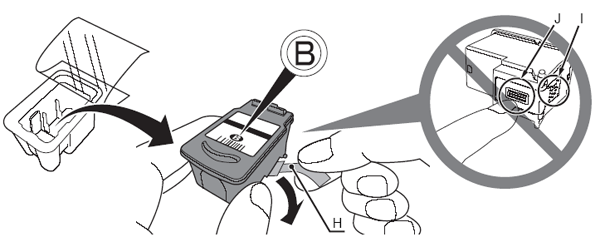 - 請勿接觸墨盒上的電氣觸點(I)或列印頭噴嘴 (J)。如果觸摸,本機可能無法正常列印。