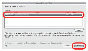 10. 在 Canon IJ Network Tool 螢幕上的「印表機(Printers)」中選擇「MP990」,然後按一下「下一步(Next)」。