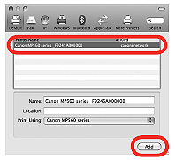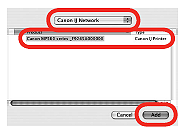 (2) 在彈出的功能表中選擇「Canon IJ Network」,在印表機清單中選擇 「Canon MP990 series」,然後按一下「新增(Add)」。
