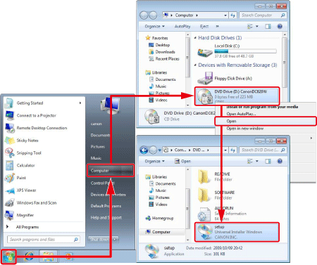 如果插入光碟時不顯示以上範例影像中出現的視窗,則電腦可能未識別到光碟。在這種情況下,請從 [開始] 選單按一下 [電腦] 或 [我的電腦],然後檢查是否顯示 [CanonDCxxxW]。