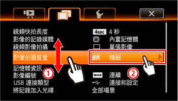 用手指上下拖曳,使 [影像拍攝質量] 進入橙色選擇列,