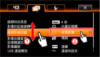 用手指上下拖曳,使 [視頻影像拍攝] 進入橙色選擇列,