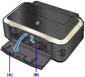 2. 確認顯示了提示您裝入可列印光碟的訊息,然後開啟內蓋(B)。