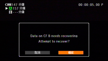 如果出現訊息 [需要還原 CF A/CF B 卡上的資料。試圖還原?],請選擇 [確定],然後按 <SET> 按鈕。